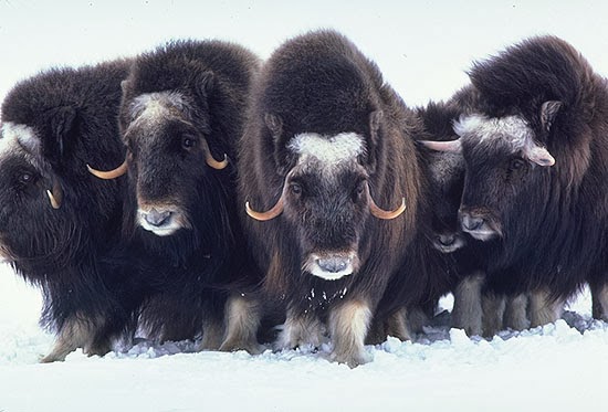 Musk Oxen will reach lengths of about 7 feet, can carry 400-900 pounds and have 2 coat layers; the outer of hair, the inner of wool. This adaptation is what helps the musk ox survive during extreme cold temperatures.